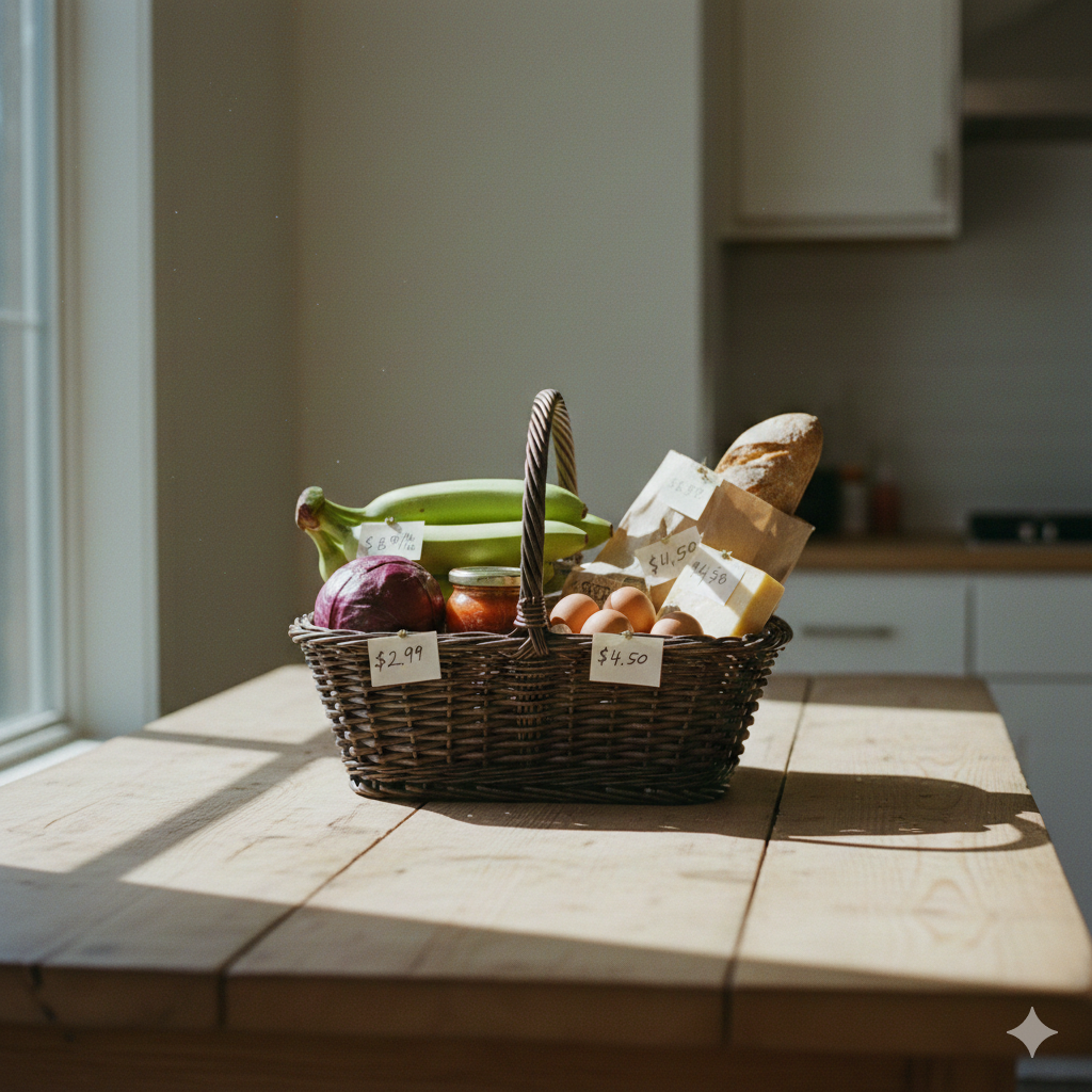 장바구니와 생필품을 통해 일상에서 체감되는 물가 상승을 상징적으로 표현한 이미지